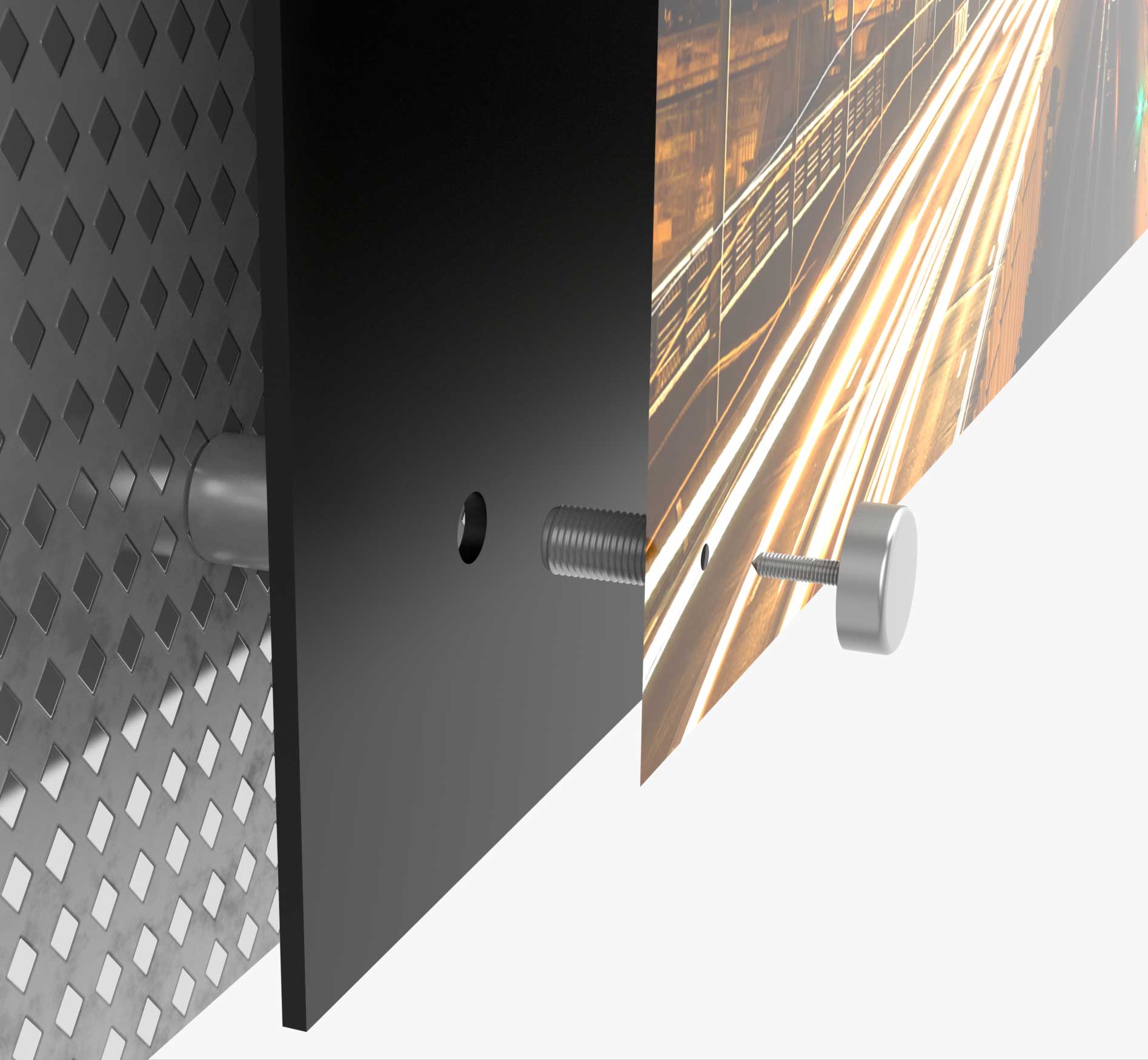 We did this by turning the front screw of the Monomount into two parts: the first part secures the back panel in place, so that when the second part, which secures the graphic image and front panel to the first part, is unscrewed, all that is released is the graphic image and front panel, while the back panel remains secured on the wall. This solution made changing the graphic images easy, fast, and safe.