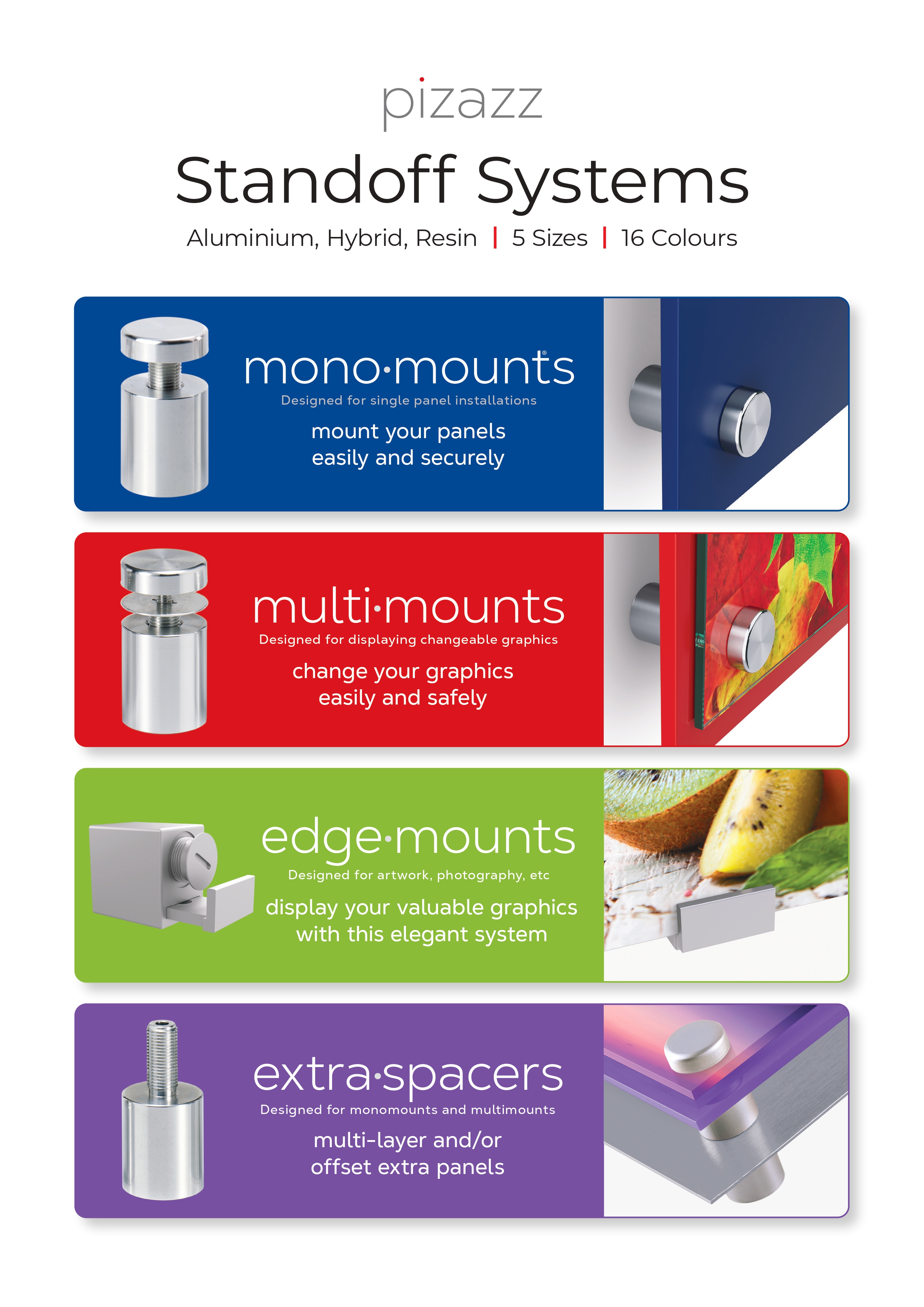 Your customers will also see the three material options, the five sizes and sixteen colours, enabling them to decide which of our four standoff systems, that will be best for their project.